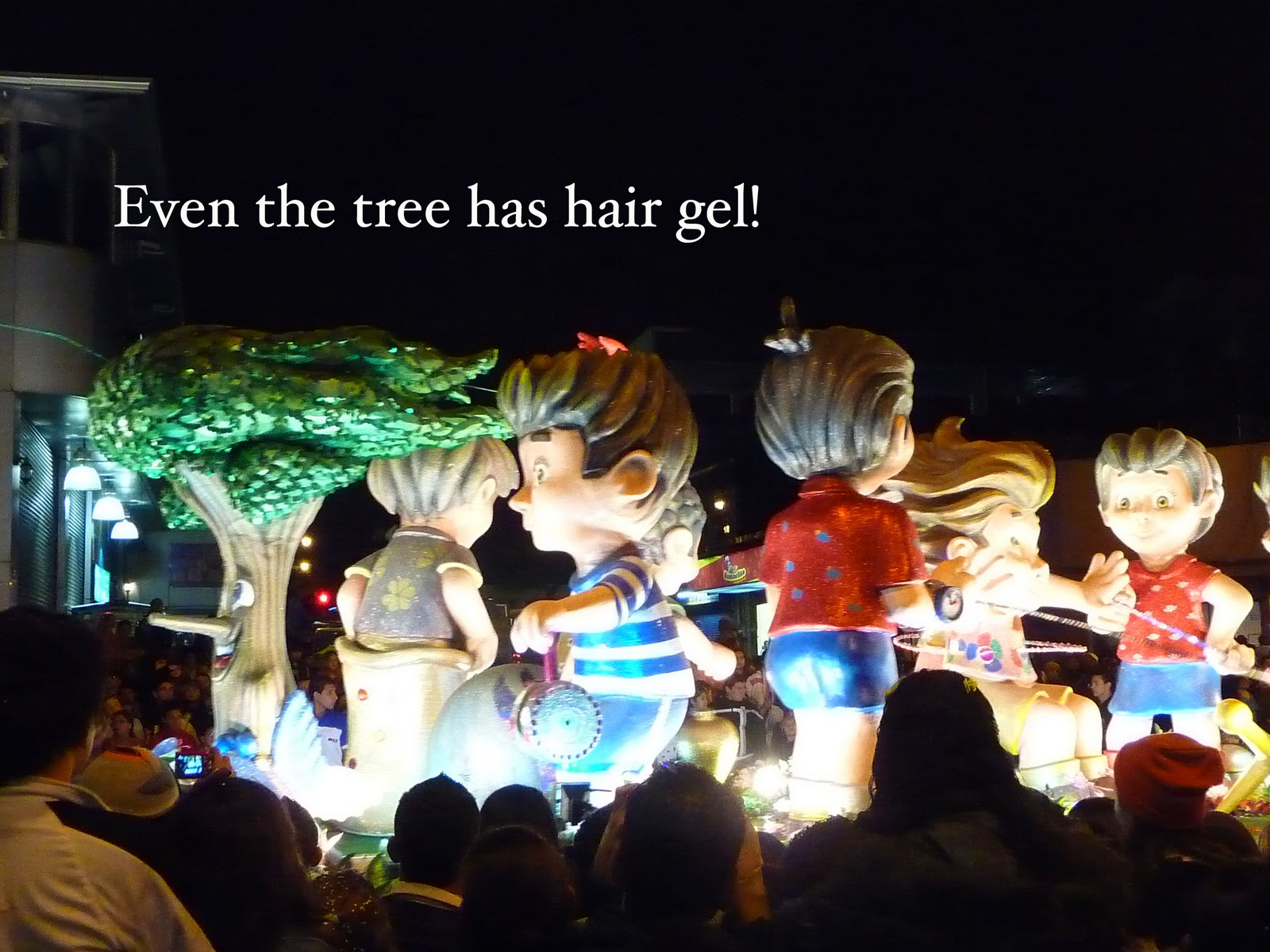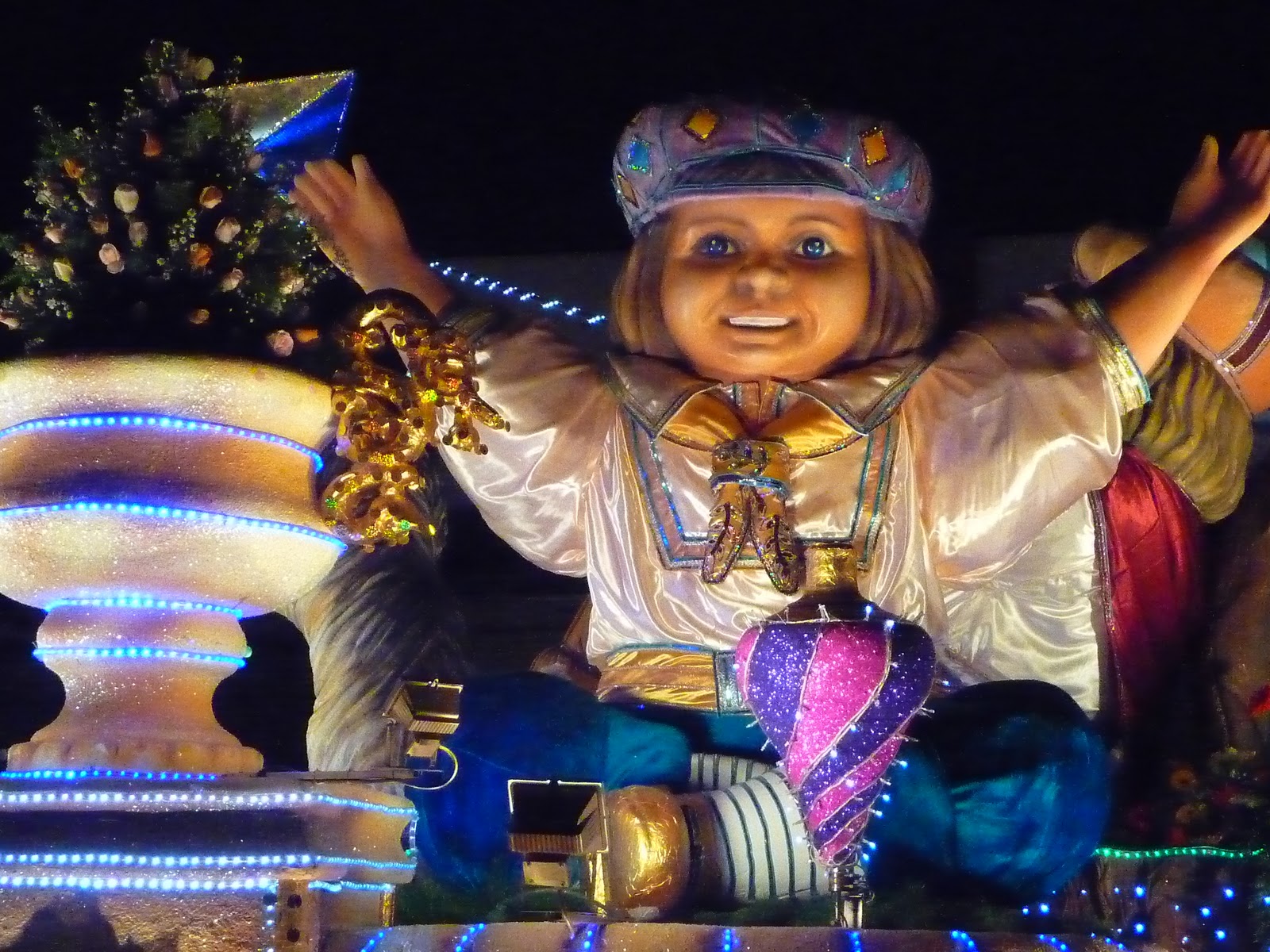 Upon settling in amongst the many young and publicly affectionate couples, we readied our cameras and waited for the fiesta to really begin. The first float wasn’t really a float at all so much as a glorified Toyota advertisement. Five Yaris’s later, a horde of Honda motorcycles rumbled down Avenida Dos, revving the commercial engines of the parade. Eventually, the festival lived up to it’s name as big, light-adorned floats crawled along brightly announcing their arrival. Most were accompanied by local marching bands, whose repertoire, we should mention, had no shortage of Lady Gaga renditions. P-p-p-poker faces removed, here are a couple of our favorite floats: