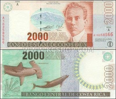 The 2,000 bill shows Clorito Picado, a scientist who was a pioneer in researching snake venom, and also conducted research that led to the discovery of penicillin.  On the other side of the bill is the hammerhead shark and the bottlenose dolphin, two animals that are found on Costa Rica´s Isla del Coco.