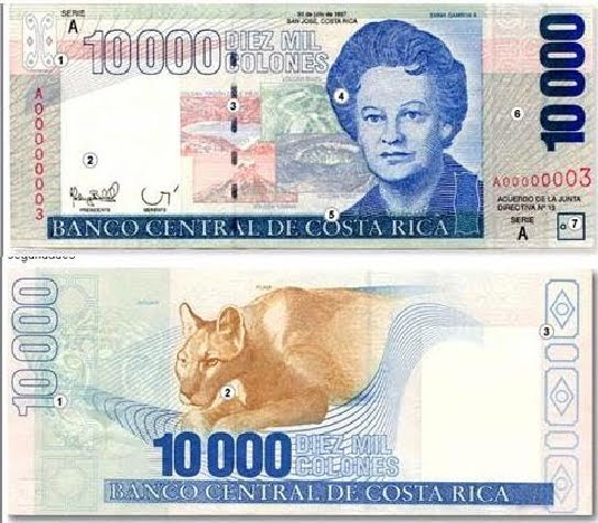 The 10,000 bill features Emma Gamboa, a teacher who helped to found the University of Costa Rica´s School of Education.  There are also four volcanoes on the front (Arenal, Poás, Irazú, and Rincón de la Vieja).  The back has a puma, along with a face of a jaguar.